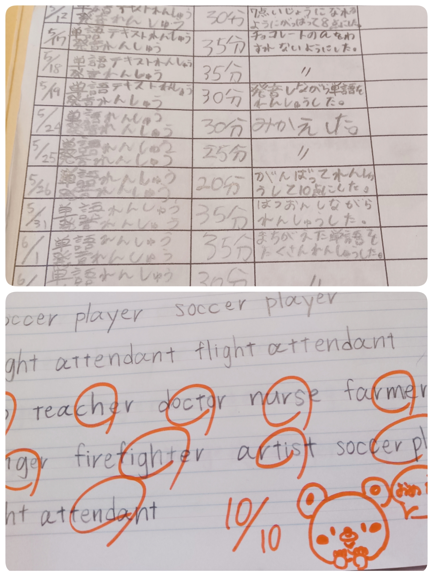 普段から宿題には「完璧に覚えるまで」取り組んでくれています。英検の語彙テストは100問ずつ、すでに4回実施しましたが、全て満点です。語彙テストと教科書単語・英文テストのどちらも、問題を見てすぐに答えを書けるまで準備をしてくれています。そのため、毎回のテストにかかる時間が少なく、1レッスンで予定以上に多くのことができています。また、間違えた問題は、次に解いた際に正解できるまで家で復習できているので、どんどん新しい問題に進めます。