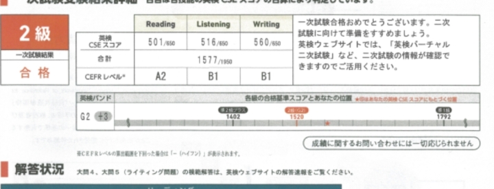 高校生レベルの内容で、ライティングとリスニングの正解率は合格者平均を上回りました。ライティングは合格者平均が70%に届かない中、78%で素晴らしい結果です。リスニングは73%の正解率でした。